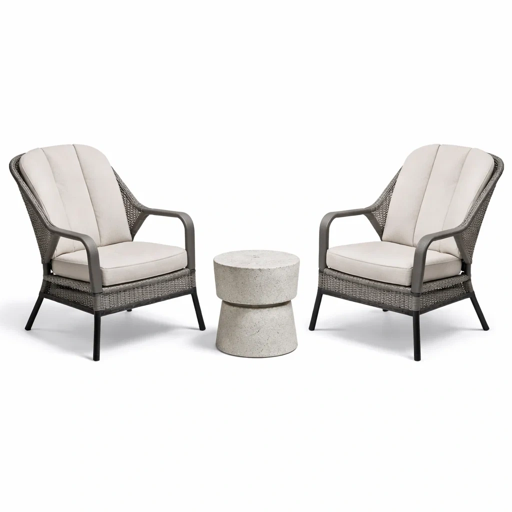 Set da relax piccolo con poltrone in rattan e tavolino in cemento
