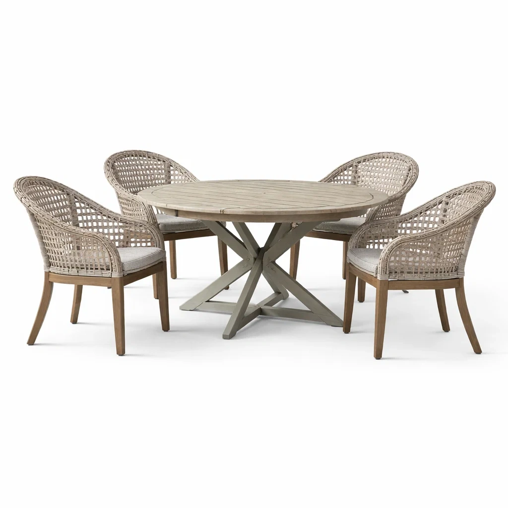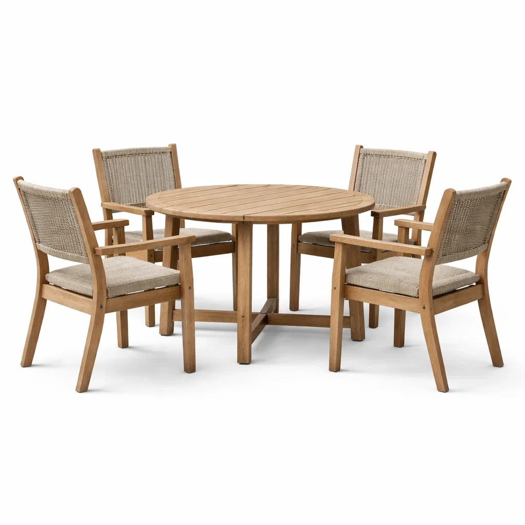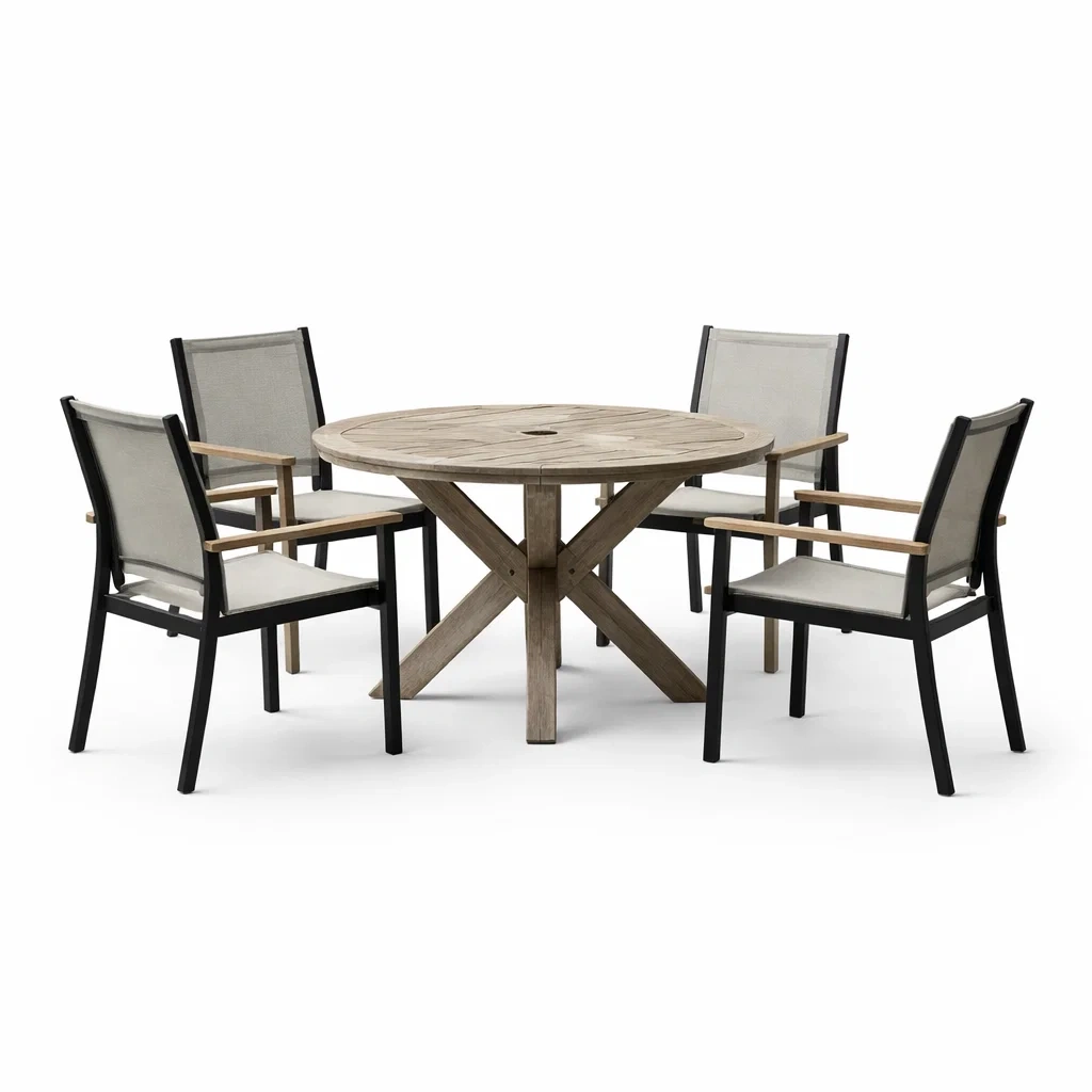 Set tavolo e sedie rotondo in legno e alluminio per esterni