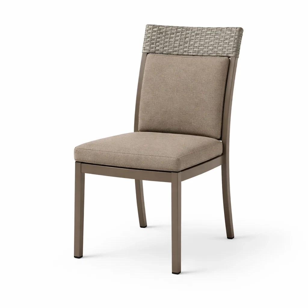 La sedia presenta una struttura in alluminio, uno schienale realizzato in rattan sintetico e un rivestimento in poliestere. L'imbottitura è in schiuma poliuretanica. La sedia misura 50x60x85 cm con un'altezza del sedile di 46 cm e una larghezza di 48 cm. Il prodotto pesa 6.5 kg e ha una capacità di carico fino a 120 kg.
