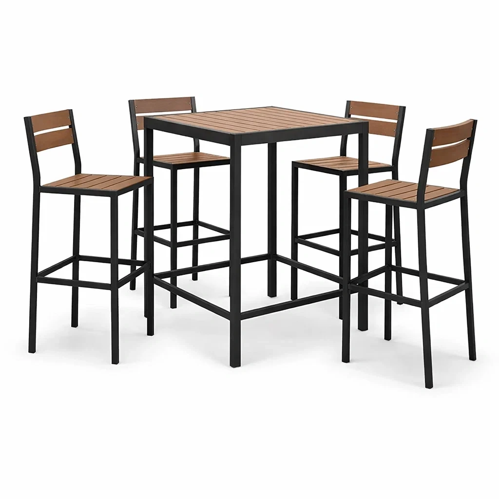 Set bar con tavolo alto e 4 sgabelli in metallo e legno composito nero marrone