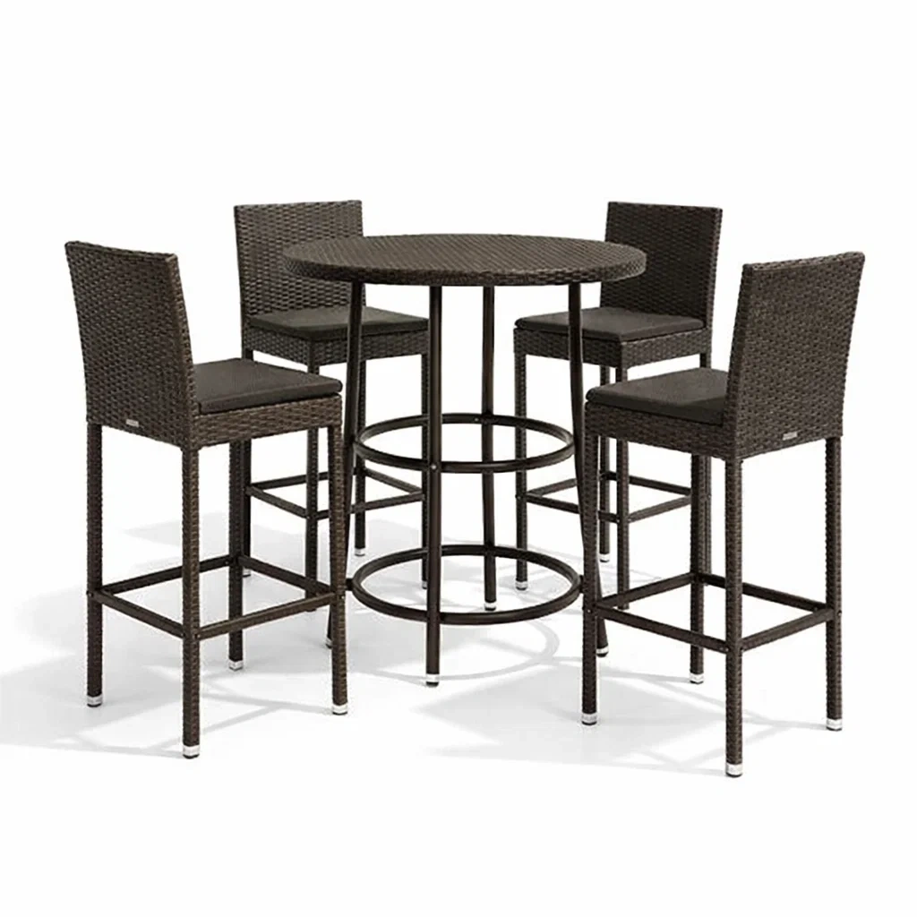 Questo set comprende un tavolo alto rotondo con struttura in acciaio e rivestimento in rattan sintetico, insieme a quattro sgabelli coordinati. Adatto per l'uso esterno.