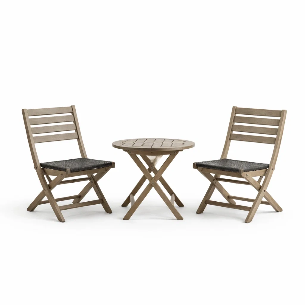 Elenco prodotti: 1 tavolo rotondo, 2 sedie pieghevoli