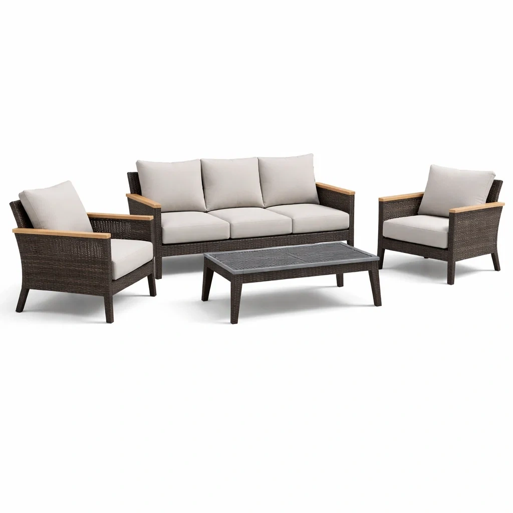 Questo set da giardino comprende un divano a tre posti, due poltrone singole e un tavolino rettangolare. La struttura è in rattan sintetico, i braccioli sono in legno e i cuscini sono in tessuto poliestere resistente all’acqua.