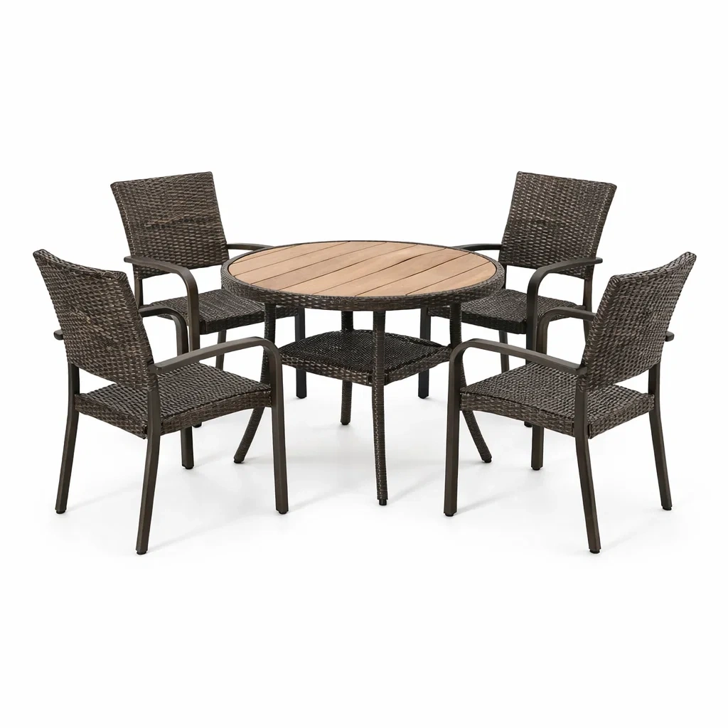 Set composto da 1 tavolo rotondo e 4 sedie in rattan.