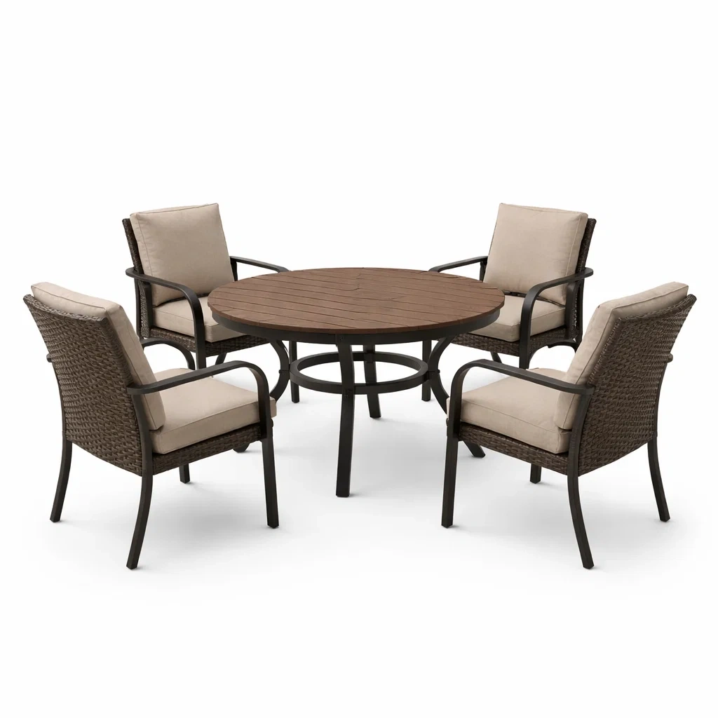 Set tavolo e sedie rotondo in legno e metallo con sedie in resina e cuscini crema